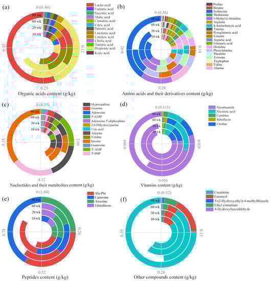 A total of 13 nucleotides and their metabolites were detected in the four samples. The total content of the 13 compounds in the 90 wk soup sample (8.25 g/kg) was the highest (Figure 2c). From Figure 2c, inosine was the most abundant compound in the four samples, and its content percentage in the 90 wk soup sample (35.54%) was the highest. The content of hypoxanthine was next to inosine in the 10 (0.88 g/kg), 20 (0.94 g/kg), and 60 (1.41 g/kg) wk soup samples. Inosine and hypoxanthine, which exhibit a bitter taste, have been found to contribute to the sourness and saltiness of beef semitendinosus muscles [24]. Therefore, the contribution of these two compounds to the taste of chicken breast soup cannot be ignored. The content of 5′-IMP (1.69 g/kg) was next to inosine in the 90 wk soup sample. Studies have shown that 5′-IMP is an important umami compound in muscle, which is derived from the degradation of adenosine triphosphate (ATP) [25]. The content of 5′-IMP decreased and then increased with chicken age and its contents were the lowest in the 60 wk soup sample in this work. Katemala et al. observed that the 5′-IMP of breast meat decreased as Korat hybrid chickens grew older during the 8–20 wk examination, which was consistent with the results observed in the present work [26]. The 5′-IMP levels were significantly higher in 22 wk Hinai-jidori chickens than in 8 wk chickens in the study by Rikimaru et al. [27]. Thus, the relationship between chicken age and 5′-IMP content appears to vary with species and rearing systems. The distribution of the compounds in the four samples showed that the 5′-GMP and uridine content were negatively correlated with chicken age, while the other compounds did not show a clear pattern with chicken age (Figure S3).