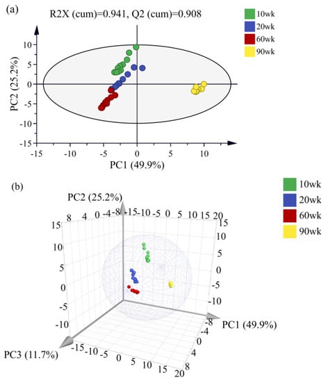 The results of the hierarchical cluster analysis (HCA) showed that the 10 and 20 wk soup samples were closest and clustered into one group (Group 3), indicating that the difference in compounds between the 10 and 20 wk soup samples was the least (Figure S7). The 60 (Group 2) and 90 wk (Group 1) soup samples were divided into two groups, and the distance between Group 1 and Group 3 was the longest, indicating that there was a great difference in the content of compounds between the old and young chicken soup samples. The principal component analysis (PCA) results of the four soup samples showed that all the samples were distributed within a 95% confidence interval (Figure 3). Additionally, the first three principal components were extracted to explain 86.8% variance information of the characteristic variables of the four soup samples (Figure 3b). From Figure 3a, the 10 and 20 wk soup samples were mainly distributed in the second quadrant, while the 60 and 90 wk soup samples were distributed in the third and the fourth quadrant, respectively. Those results reflected the difference in the compounds between the 90 wk soup sample and the other three samples. This result corresponded to that of the HCA and sensory evaluation.