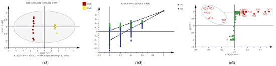 Figure 4. The OPLS-DA scores plots, permutation test plot, and corresponding S-plot of 10/90 (a1c1), 20/90 (a2c2), and 60/90 (a3c3) wk models (c1c3). *, the multiplication sign. The 15 compounds with the largest VIP values in S-plot (c1c3) are labeled in light red ( Foods 12 00674 i001), and those with VIP ≥ 1 are labeled in bright red ( Foods 12 00674 i002). P02, creatinine; P10, isoleucine; P11, hypoxanthine; P16, guanine; N01, lactic acid; N21, propionic acid; N22, carnosine; N23, adenine; N24, anserine; N28, inosine; N34, 5′-AMP; N35, 5′-IMP; N37, glutathione.