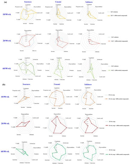 Additional experiment results showed that lactic acid, 5′-AMP, and 5′-IMP particularly contributed to the sourness of three soup samples (Figure 5b), but no correlation was found between their concentration and the ability to enhance the sourness of the chicken soup. The reason might be the buffering action of the peptides in the chicken soup samples [36]. Compared with lactic acid, which had the highest signal intensity of sourness, 5′-AMP was more efficient at enhancing the sourness of three soup samples. From Figure 5b, the addition of 5′-AMP increased the sourness scores of the 10 (0.49 g/L added), 20 (0.63 g/L added), and 60 (0.64 g/L added) wk soup by 3.91, 2.20, and 3.30 points, respectively, with 5′-AMP increasing the sourness intensity of the 10 wk soup the most. The 5′-AMP was proven to enhance not only the sourness but also the umami taste of stewed sheep tail fat in a previous study [14]. Notably, carnosine without sourness showed an effect of masking the sourness of chicken soup, and its ability to reduce sourness was positively correlated with concentration, which might be due to the amphoteric ions it contains [36]. The umami-enhancing effect of differential compounds was mainly shown in the 10 wk soup samples (Figure 5b). The carnosine with the highest umami intensity had the best umami-enhancing effect in the 10/90 wk model, with the addition of carnosine (0.23 g/L) increasing the umami score of the 10 wk soup by 0.28 points. In a study by Luo et al., carnosine was proven to contribute to the quality and umami taste of meat [39]. Creatinine, anserine, inosine, and hydroxypurine also showed better umami enhancement in this work, of which inosine has been reported to improve the umami and saltiness of stewed sheep tail fat [14]. For saltiness, carnosine and anserine with higher saltiness scores were more effective at enhancing the saltiness of the chicken soup. Among them, the addition of carnosine increased the saltiness scores of the 10 (0.23 g/L added), 20 (0.12 g/L added), and 60 (0.17 g/L added) wk soup by 0.52, 0.26, and 0.57 points, respectively, with carnosine increasing the saltiness intensity of the 60 wk soup the most. Isoleucine without saltiness also showed a saltiness-enhancing effect. Luo et al. reported that isoleucine contributed to the taste of dry-cured mutton ham, and the sourness intensity of ham increased with increasing levels of isoleucine [39]. Considering the synergistic effect of sourness and saltiness, the saltiness enhancement of the chicken soup with isoleucine might be related to its sourness-enhancing ability. Considering the variety of taste-active substances in chicken soup and the complexity of the taste perception in oral processing, the mechanism of taste modulation of differential compounds in chicken soup needs to be further investigated [40].