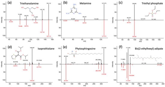 Mirror plots of the acquired MS/MS spectra (black) of six representative compounds against reference spectra (red) in compiled libraries, as detailed in Section 2.4. (a) Triethanolamine; (b) Melamine; (c) Triethyl phosphate; (d) Isoprothiolane; (e) Phytosphingosine; (f) Bis(2-ethylhexyl) adipate.