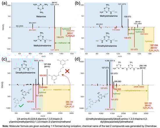 Elucidation of four melamine derivatives based on their similarity in MS/MS spectra. (a) Methylolmelamine; (b) Dimethylolmelamine; (c) ((4-amino-6-((((4,6-diamino-1,3,5-triazin-2-yl)amino)methyl)amino)-1,3,5-triazin-2-yl)amino)methanol; (d) (((methylenebis(azanediyl))bis-(6-amino-1,3,5-triazine-4,2-diyl))bis(azanediyl))dimethanol.