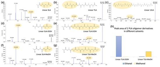 Spectra of linear PLA oligomers and their esterification products with ethanol and methanol. (a) Linear 3LA; (b) Linear 7LA; (c) Linear 12LA; (d) Linear 3LA-EtOH; (e) Linear 7LA-EtOH; (f) Linear 3LA-MeOH; (g) Linear 7LA-MeOH; (h) peak area of Linear 7LA-EtOH and Linear 7LA-MeOH in extracts with ethanol and methanol as solvents.