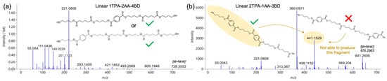 Discrimination of isomers of PBAT oligomers by MS/MS spectrum: (a) two isomers of Linear 1TPA-2AA-4BD not discriminated; (b) isomers of Linear 2TPA-1AA-3BD differentiated by a characteristic product ion (441.1529).
