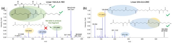 Representative spectra of PBAT oligomer derivatives. (a) Linear 1AA-2LA-1BD; (b) Linear 2AA-2LA-2BD.