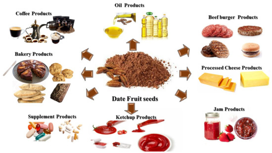 The Statistics Division of the Food and Agriculture Organization of the United Nations (FAOSTAT, 2020) [22] reported that the global production of date palm fruit (Phoenix dactylifera L.) is around 9.5 million tons yearly. Date palm fruit processing results in the production of massive quantities of date seeds as a waste byproduct, establishing 6.11–11.50% of date fruit weight depending on the variety, grade, and quality [23,24]. In the past, date fruit seeds were utilized as soil fertilizers and animal feed [25]. Nevertheless, they have increasingly been utilized in functional foods such as beef burgers, bread, muffins, cookies, processed cheese, coffee, ketchup, gluten-free cookies and biscuits, cooking oil, cakes, jams, and bio-oil, and have also been utilized in dietary supplementation, pharmacology, and cosmetics [26,27,28,29,30,31,32,33,34,35]. Figure 1 shows products that are fortified with DFS. Furthermore, date fruit seed (DFS) was shown to be principally rich in fiber and considerable amounts of vitamins, minerals, lipids, carotenoids, and protein [36,37,38,39]. Likewise, DFS is also considered to be a source of flavonoids and polyphenols, depending on the variety. The polyphenolic and flavonoid content of DFS is approximately 51 g/kg, which is higher when equated with other polyphenol-rich foods such as flaxseeds, grapes, and green tea [40,41,42]. Nevertheless, the polyphenolic compounds present in DFS have been shown to have anti-inflammatory and antioxidant properties that could be used to prevent and treat obesity, cancer, cardiovascular diseases, and neurodegenerative conditions [23,43,44,45].