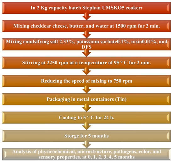 Standard cheddar cheese (Fat/DM: 55.8 and protein 25.1%), frozen cheddar cheese (Fat/DM: 54.2 and protein 24.2%), and milk fat butter (fat: 81.7%, SNF: 1.4) were obtained from Fonterra Inc., Auckland, New Zealand. Emulsifying salt, Joha C Special, was obtained from BK Giulini, Ladenburg, Germany. Antibacterial agent, Nisin (E234), was obtained from Danisco, Copenhagen, Denmark. Antifungal agent, potassium sorbate, was obtained from Nutrinova, Sulzbach, Germany. Plate count agar medium, Baird–Parker agar medium, sulfite–cycloserine agar medium, egg yolk polymyxin agar medium, violet red bile agar medium, nutrient agar medium, and notato dextrose agar medium were purchased from HiMedia Laboratories Pvt. Ltd., Mumbai, India. Sulfuric acid 98%, H3BO3 (boric acid; reagent-grade, ≥98%; pellets (anhydrous)), phenolphthalein reagent (3,3-Bis(4-hydroxyphenyl)-1(3H)-isobenzofuranone), glutaraldehyde solution (Grade I, 25% in H2O, specially purified for use as an electron microscopy fixative), phosphate-buffered solution, osmium tetroxide (ReagentPlus®, 99.8%), ethyl ether (analytical-grade), ethanol (absolute for analysis EMSURE® ACS, ISO, Reag), and petroleum ether (ACS reagent) were purchased from Millipore Sigma Chemical Co. (St. Louis, MO, USA).