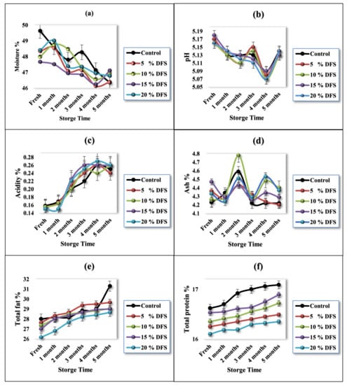 (a–f) Characterization of cheeses fortified with 5%, 10%, 15%, and 20% DFS as a partial substitution for butter in moisture, pH, acidity, ash, total fat, and total protein % during storage.