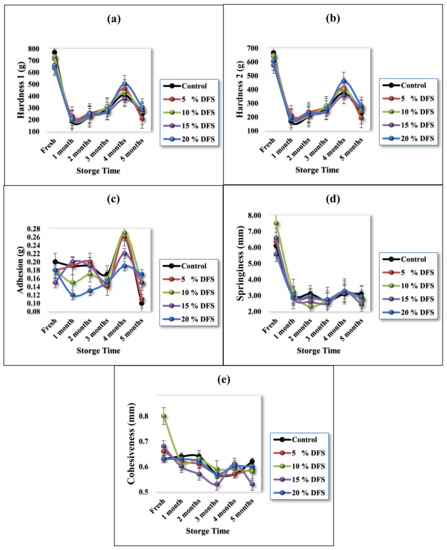 Figure 4c presents the adhesion, which also non-significantly (p ≥ 0.05) decreased with hardness. The control sample had an adhesion value of 0.2 ± 0.01 g, while, for 5%, 10%, 15%, and 20% DFS, these values were 0.18 ± 0.02, 0.18 ± 0.02, 0.15 ± 0.04, and 0.18 ± 0.01, respectively. During storage, control cheese samples showed a significant (p ≤ 0.05) decrease after four months, while 5% DFS treatment showed a significant (p ≤ 0.05) decrease in months 3 and 5. Treatment with 10% DFS showed a significant (p ≤ 0.05) decrease only in month 4, and, with 15% DFS, showed a non-significant (p ≥ 0.05) decrease; furthermore, 20% DFS showed a significant (p ≤ 0.05) decrease only in months 2 and 3. Adhesion can be influenced by the emulsifying ingredient; nevertheless, DFS is considered a good emulsifying ingredient. Polysaccharides such as glucans, xylans, mannans, and cellulose, which are associated with DFS proteins, enhance their functional properties, improving the capabilities of DFS as an emulsifier [61,62].