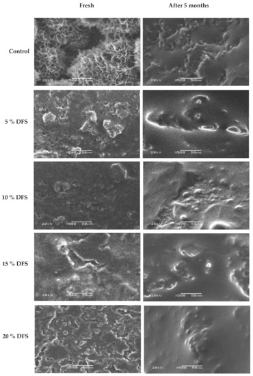 The microstructure properties of block-type processed cheese fortified with 5%, 10%, 15%, and 20% DFS were examined in terms of their internal microstructure by scanning electron microscopy (magnitude 500×; at 20 kV), when fresh and after five months of storage, as illustrated in Figure 5. For fresh cheese, the control cheese had a compact structure and was homogenously uniform compared with the cheeses fortified with 5%, 10%, 15%, and 20% DFS, while the fortified cheeses showed a less compact and inhomogeneous structure which increased with an increase in the % of DFS as a partial substitution for butter. Nevertheless, a filamentous-like structure could be observed through the cheese network as one of the structural characteristics of cheeses fortified with DFS. This structure appeared to have low electronic density, which might be attributed to the fiber content of DFS-fortified cheeses. After five months of storage, the overall structure of the cheeses became more open with a less compact cheese network, which increased with increasing DFS%. Furthermore, the surface of the protein matrix of fortified cheeses by DFS appeared to be coarse and the matrix itself was less compact and denser, which increased with an increase in the DFS%. These changes could probably be attributed to the protein-binding ability and emulsification capacity of added DFS. This description of the microstructure is in agreement with that previously reported for block-type processed cheese [63].