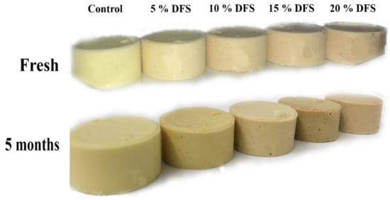 Fresh processed cheese samples fortified with DFS exhibited the darkest color, whereas, with an increasing ratio of fortification of DFS (Figure 6), the whiteness values of the processed cheese samples decreased. During the storage period, the processed cheese became darker. This could be due to the Maillard browning reaction, which occurs during storage between the lactose and proteins in cheese [62].