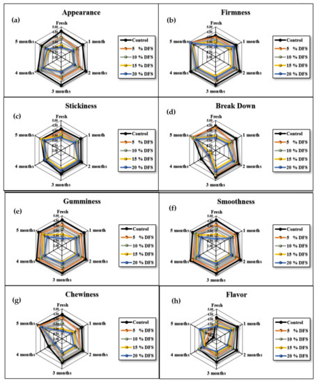 (a–h), Appearance, firmness, stickiness, breakdown, gumminess, smoothness, chewiness, and flavor of cheeses fortified with 5%, 10%, 15%, and 20% DFS as a partial substitution for butter during storage.