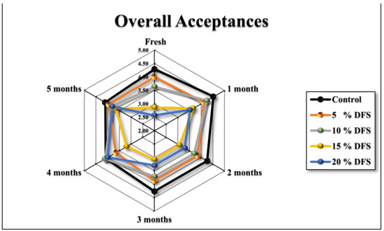 Since this newly-developed block-type processed cheese based on DFS fiber is destined to be consumed by humans, the acceptance of sensory attributes is an important aspect. In general, higher concentrations of DFS% and extended storage had adverse effects on the sensorial attributes of cheeses. Figure 7a–h and Figure 8 show that the appearance, firmness, stickiness, breakdown, gumminess, smoothness, chewiness, flavor, and overall acceptance gradually decreased, although not significantly (p ≥ 0.05), with increased DFS, compared with the control. However, at 15 and 20% DFS, the decrease was significant (p ≤ 0.05), and the breakdown in particular was decreased significantly (p ≤ 0.05) at 20% DFS. During the storage period, there were increases and decreases in the values; however, these were not significant, except for those at 15 and 20% DFS after four and five months. The data are summarized in Figure 8 as overall acceptance.