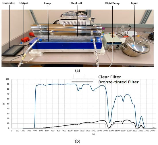 (a) Pilot-scale pulsed light operation set-up; (b) transmission spectrum of 3 mm clear and bronze-tinted polycarbonate solid sheets (lighter blue line for clear filter; darker black line for bronze-tinted filter).
