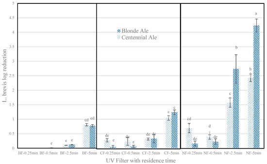 L. brevis log reductions after different PL treatments (bar values represent mean values, and error bars represent standard deviation, n = 3). One-way analysis of variance (ANOVA) was conducted on log reductions across all treatments. The same letters on top of bars indicate that values are not significantly different (p > 0.05). Treatments are reported as (filter condition)-(residence time (s)). NF: no filter; CF: clear filter; BF: bronze-tinted filter; UV: ultraviolet.