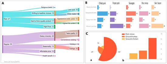 Russian consumer attitude towards pork attributes: (A) Russian consumer motives for choosing pork (%); (B) Consumer attitudes towards pork products bought over the past 1–2 years, % of respondents (survey 1); (C) The Russian consumers preferences for minced meat: (a) Net Promoter Score; (b) Percentage of mentions of fat content. Note: 1 Ponamoreva E. Trends Laboratory (LLC Business Integrator Territory of Success) & Agro-Belogorye, conducted in March 2022 [19]. Source: Authoring.