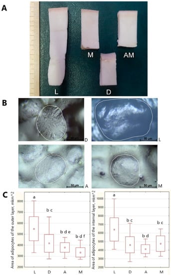 Pigs of breeds M and A had the smallest average adipocyte sizes in the outer layer, while L pigs had the largest—by 39% and 24% relative to M and A, (p < 0.001). Meanwhile, deep layers of subcutaneous fat in samples from all breeds studied revealed adipocytes of 10–30% (p < 0.001) greater size than adipocytes in the outer layer. The largest adipocyte sizes in the inner layer of ridge fat were also observed in breeds L and D. These findings are interesting, as the Duroc is considered one of the leanest breeds of pig, and it is expected that backfat tissue will have the smallest adipocyte sizes [38].