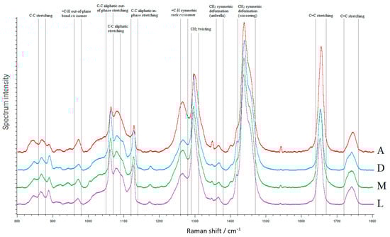 The Raman spectra of pig fat samples were mainly represented by bands due to oscillations of hydrocarbon chains (saturated and unsaturated structures) (Figure 3). The peaks at 970 cm−1, 1266/1272 cm−1, and 1655 cm−1 reflect the degree of unsaturation, while the signals at 1297/1301 cm−1, 1430/1460 cm−1 and 1735/1746 cm−1 correspond to saturated bonds or ester groups [28,44]. The mean intensities were 0.529505 for A; 0.452598 for M; 0.37439 for L; and 0.36496 for D.
