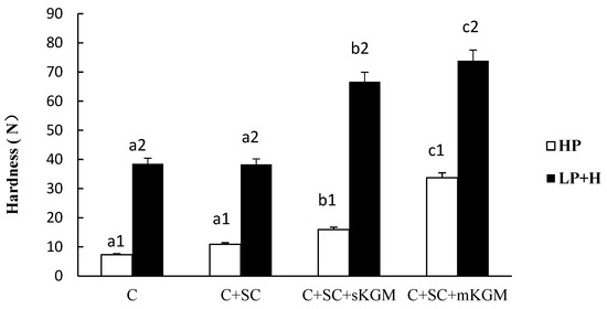 The hardness value of the different treatments was showed in Figure 1. Gel LP + H presented with an increased hardness than the HP sample (p < 0.05). These results seem to indicate that higher temperature induced more cross linkage between the myosin proteins and SC and KGM. The control (C) gel had lowest hardness, while C + SC + mKGM had the highest values. SC did not increase the hardness of gels while KGM significantly increased their hardness. Pietrasik and Jarmoluk [27] used SC and k-carrageenan (CGN) to research binding and textural properties of pork muscle gels; they reported that SC can increase the effect on hardness, which was dependent on the content of CGN in homogenates. This might mean that SC did not increase gel hardness but can combine with other colloids to increase the hardness of mixed gels. Hermansson [28] had the perspective that SC cannot form self-supporting gels but rather acts as a paste in meat systems. The reason proposed for this difference in hardness is that SC is a kind of non-gelling additive that is not capable of forming an undivided network structure; however, KGM is a gelling polysaccharide that is able to form a network structure. Furthermore, the hardness of gels that contained SC and KGM at a ratio of 2:1 was higher than those with a ratio of 1:1. These results indicated that different ratios of SC and KGM in myosin mixed gels resulted in a different interactive effect. We supposed that KGM, water, and myosin aggregated and formed a network structure by hydrogen bonding, molecular dipoles, transient dipoles, and so on.