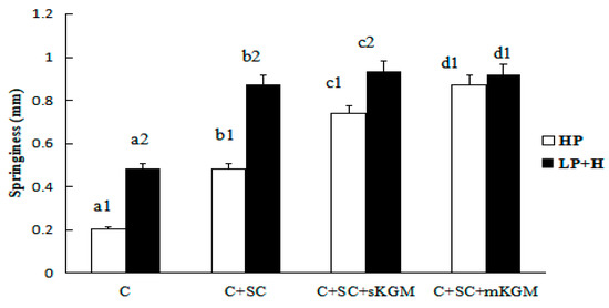 The springiness properties of the gels are shown in Figure 2. The HP sample springiness values varied from 0.200 to 0.871 mm and the LP + H sample values varied from 0.484 to 0.921 mm. The control showed the lowest springiness values while the C + SC + mKGM sample showed the highest values. Both SC and KGM significantly increased the springiness of gels, which was increased more in SC than in KGM. This may attribute to the good emulsifying ability of SC. The springiness of C + SC + mKGM and C + SC + sKGM in LP + H treatment had no obvious difference. While in the HP treatment, with increasing the level of KGM, the springiness was significant increased.