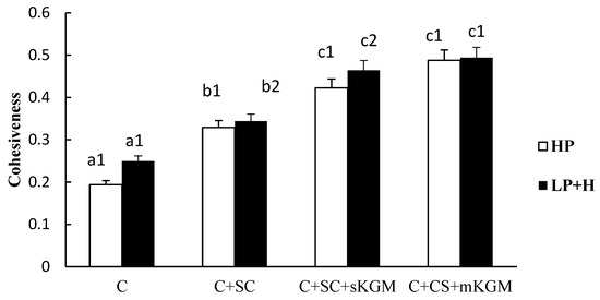 The cohesiveness properties of the gels are shown in Figure 3. The cohesiveness values of LP + H treatment were slightly higher than HP treatment. The control sample had the lowest values while the C + SC + mKGM sample showed the highest values. Increasing the amount of KGM showed no obvious increase. This indicated that SC and KGM had a synergetic effect in myosin gel systems. Both SC and KGM can significantly increase the cohesiveness of gels, which was increased more by KGM than SC. These results indicated that SC and KGM significantly increased the viscosity and thickness of myosin protein gels. The force of the molecular structure became stronger.