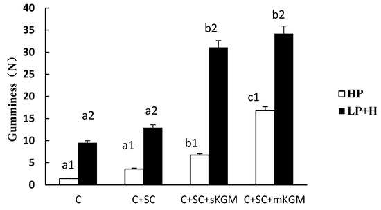 The gumminess properties of the gels are shown in Figure 4. The gumminess of myosin gels was very low. When adding SC, the gumminess of the gel showed no significant increase; however, when adding small amounts of KGM, the gumminess of gels significantly increased in both HP and LP + H samples. This may suggest that a higher pressure (500 MPa) can improve the gumminess of KGM compared to the 200 MPa pressure. SC did not increase the gumminess of gels, while KGM can significantly increase their gumminess. KGM has a very high gumminess; it can stick to myosin proteins to form compact network gels.