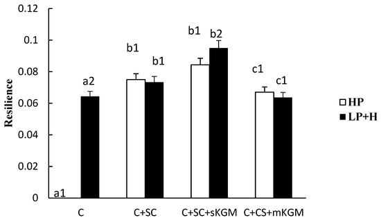 Different numbers (1 or 2) in the same sample indicate significant differences (p < 0.05) between HP and LP + H treatment. Different letters (a, b, c or d) in the same batch indicated significant differences (p < 0.05) among the sample. The Figure 1, Figure 2, Figure 3, Figure 4 and Figure 5 were the same.
