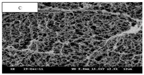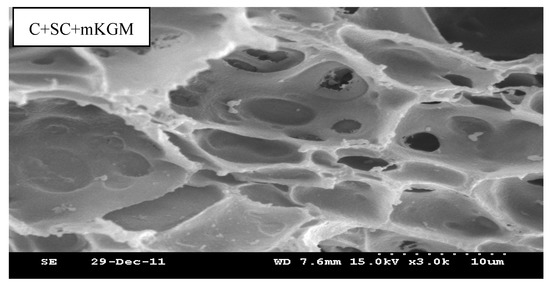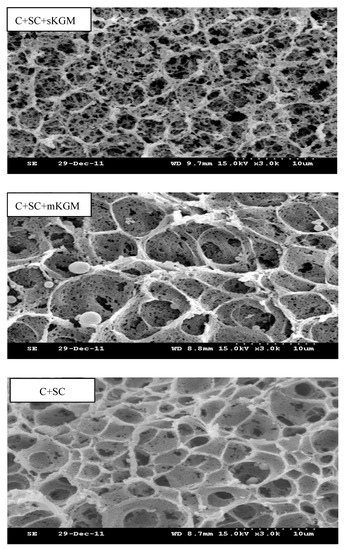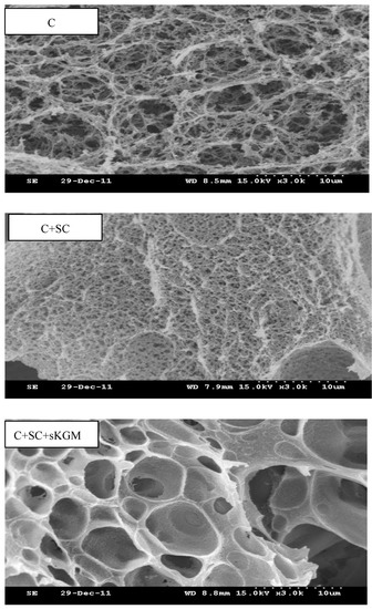 It has been shown that 200 Mpa is the optimal pressure for hydrophobic interactions [34]. At 200 MPa, when only myosin in present, the gel was composed of disrupted, loose strands with an irregular order with many small cavities. When adding the SC, gels exhibited a fine gel matrix, consisting of a compact and smooth three-dimensional network with a uniform filament structure and higher cross linkage than only myosin. This seemed to indicate that a good SC-myosin interaction was formed. C + SC + sKGM gels exhibited a coarse structure with bigger cavities but a lesser network structure than C + SC + mKGM gels. Many small white balls “floated” in the protein matrix, which may be insoluble myosin. Whether an interaction exists between the myosin protein and the SC and KGB components cannot be determined from these micrographs. We only found that a good interaction exists between the myosin protein and SC and KGM.