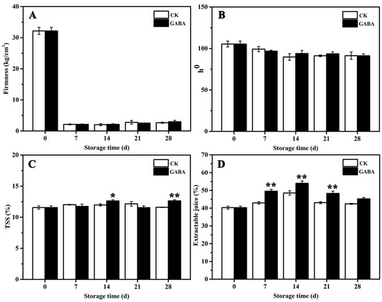 Effect of exogenous GABA on peach fruit quality. (A) Firmness, (B) L*, (C) TSS, and (D) extractable juice. All data are expressed as means ± standard errors (SE). Asterisks (*) indicate significant differences between the GABA and CK groups. Unpaired Student’s t-test; (*) p < 0.05, (**) p < 0.01.