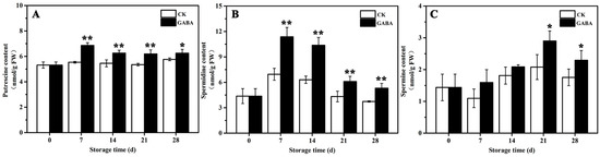 Change in (A) putrescine, (B) spermidine, and (C) spermine in peach fruit induced by GABA. All data are expressed as means ± standard errors (SE). Asterisks (*) indicate significant differences between the GABA and CK groups. Unpaired Student’s t-test; (*) p < 0.05, (**) p < 0.01.