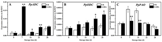 Change in the expression of (A) PpADC, (B) PpODC, and (C) PpPAO in peach fruit induced by GABA. All data are expressed as means ± standard errors (SE). Asterisks (*) indicate significant differences between the GABA and CK groups. Unpaired Student’s t-test; (*) p < 0.05, (**) p < 0.01.