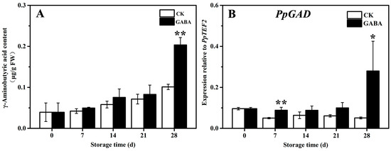Change in (A) GABA content and (B) PpGAD expression in peach fruit induced by GABA. All data are expressed as means ± standard errors (SE). Asterisks (*) indicate significant differences between the GABA and CK groups. Unpaired Student’s t-test; (*) p < 0.05, (**) p < 0.01.