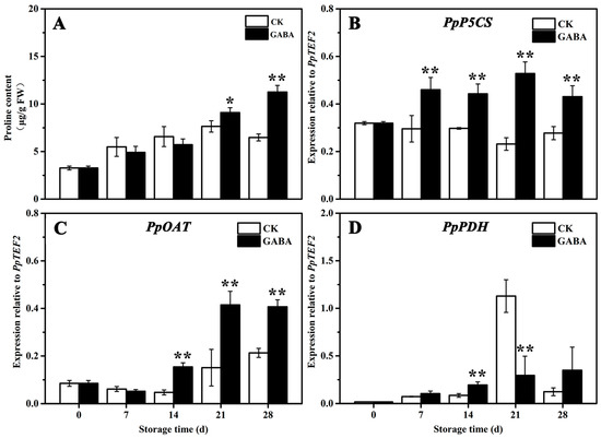 Change in (A) proline content and the expression of (B) PpP5CS, (C) PpOAT, and (D) PpPDH in peach fruit induced by GABA. All data are expressed as means ± standard errors (SE). Asterisks (*) indicate significant differences between the GABA and CK groups. Unpaired Student’s t-test; (*) p < 0.05, (**) p < 0.01.