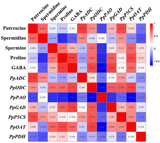 The metabolite correlation analysis found a significant positive correlation between Put content and Spd content (r = 0.652, p < 0.05), between proline content and Spm content (r = 0.615, p < 0.05), and between proline content and GABA content (r = 0.791, p < 0.05). The correlation analysis of gene expression showed that PpODC expression was significantly positively correlated with PpGAD/PpP5CS/PpOAT expression (r = 0.7–0.8, p < 0.05), and that PpPAO expression was significantly negatively correlated with PpODC/PpOAT expression (r = −0.7–−0.6, p < 0.05). PpOAT expression was positively correlated with PpGAD expression (r = 0.546, p < 0.05) and PpP5CS expression (r = 0.552, p < 0.05).