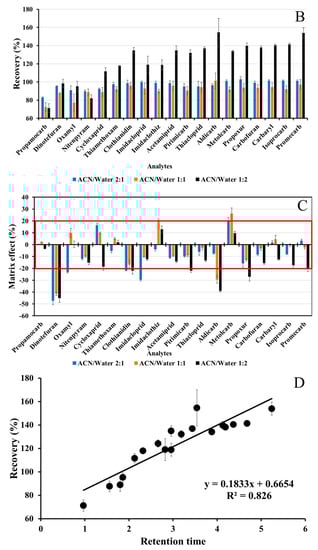| Propoxur | 5.0–500.0 | 0.9996 | 2.0 | 5.0 | −6.5 | 100.0 | 99.8 | 2.5 | 1.5 | |