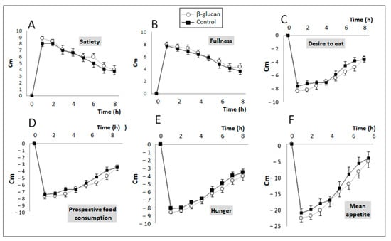 However, when the results were expressed as AUCs for each of these variables (Table 2), paired comparisons indicate that breakfast with β-glucan-enriched foods non-significantly decreased “desire to eat” (p = 0.05) and significantly decreased hunger and prospective food consumption (p = 0.04 and p = 0.033, respectively). Accordingly, the subjects’ mean appetite score also significantly decreased in the β-glucan period (p = 0.014).