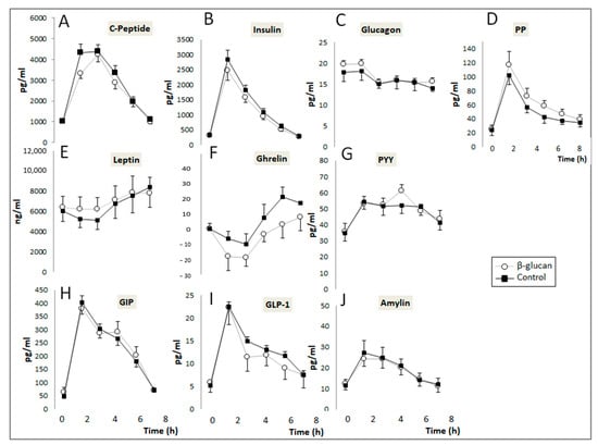 Regarding post-prandial changes in the other digestive hormones, we observed a significant decrease in post-prandial ghrelin and an increase of GIP and PP with β-glucan breakfast, while leptin, GLP-1, PYY, glucagon, and amylin were not affected. GLP-1, PYY, leptin, and PP are anorexigenic hormones while ghrelin is orexigenic. In addition, amylin, which is released by pancreatic β-cells, may also act in the brain, producing satiety-like effects []. Consequently, all these hormones are involved in the highly complex process of appetite/satiety regulation []. Regarding our results, it is likely that the decrease in plasma ghrelin and the increase in PP help to explain the lower mean appetite score observed after breakfast with β-glucan, in the absence of changes in the other anorexigenic hormones. Although several studies have assessed the impact of β-glucan on digestive hormones, they did not determine as many hormones simultaneously as in our study. Our results confirm those reported by Barone Lumaga et al. who also observed a reduction in plasma ghrelin and an increase in PP with the intake of a drink containing 3 g of β-glucan in healthy volunteers, with no changes in PYY, GLP1, and GIP []. Vitaglione et al. [] and Juvonen et al. [] also reported reduced ghrelin levels with bread or pudding containing β-glucan, respectively, while in both studies, an increase in PYY levels was also observed, in opposition to our observations. In another study, ingestion of a whole-meal rye bread containing oat β-glucan concentrate resulted in a decrease of GIP with no change in GLP-1 []. Some studies were also conducted in patients with obesity or metabolic syndrome, showing that acute administration of β-glucan enriched foods dose-dependently increases PYY [], increases CCK without affecting ghrelin (8), or decreases GIP without affecting insulin, GLP-1, or ghrelin []. Beck et al. also demonstrated that β-glucan supplementation for three months in overweight women on an energy-deficient diet resulted in decreased plasma leptin, PYY, and GLP-1 levels and increased CCK []. In contrast to other studies, we observed increased plasma levels of GIP after breakfast with β-glucan. GlP is mainly secreted by enteroendocrine K-cells located in the proximal gut epithelium, which explains the rapid onset of its secretion after a meal. Dietary fat has been shown to be the most potent stimulator of GIP secretion in humans []. Consequently, it is possible that the higher levels of GIP observed in our study are due to the fact that the lipid content of the β-glucan breakfast was slightly higher than that of the control, a difference inherent to the elaboration of the β-glucan-containing foods to maintain good acceptability of these products. In addition to its well-described role as an incretin hormone acting on pancreatic β-cells and in the control of lipid metabolism in adipose tissue, GIP has recently been shown to regulate progenitor cell proliferation in the central nervous system, behavior, and bone remodeling [].