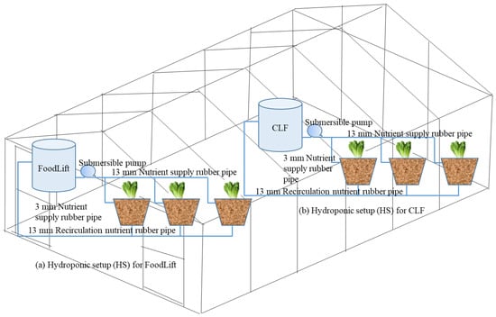 To compare the yield and nutrient concentrations of produce obtained using FoodLift, experiments were repeated using commercial liquid fertilisers (CLF). CLF used in the experiments was sourced from a commercial hydroponic solution provider [41]. There were two types of CLFs, namely, Hydro Grow and Hydro Bloom. Hydro Grow was used for lettuce for the whole growth cycle. In the case of cucumber and tomato, Hydro Grow was used during the vegetative growth stage and Hydro Bloom was used during the reproductive growth phase to meet the nutritional requirements for flowering and fruiting of the 2 crops. Both FoodLift and CLF nutrient tanks were setup side by side as shown in Figure 1. Table 2 shows the characteristics of nutrient solutions for hydroponics prepared following the Dutch Fest HydroGrow [41] instructions. A more detailed characterisation of FoodLift is provided in Siddiqui et al. [35]. Siddiqui et al. [34,35] reported that the macronutrient (nitrogen and phosphorus) concentrations in FoodLift makes it ideally suited to be used as a hydroponic feed solution.