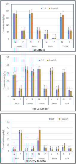 Figure 2 and Table S1 show the average concentration of macronutrients (N and P) in harvested parts of plants, such as fruits, roots, stems, stalks and leaves of lettuce, cucumber, and cherry tomato. Leaves of lettuce and fruits of cucumber and cherry tomato are the edible part of these vegetables. N and P concentrations in the leaves of lettuce and fruits of cucumber, and other plant structural parts grown using FoodLift, were observed to be similar to those of CLF. This is also reflected in the significance analysis (t-distribution test) as shown in Table 4. The p values were estimated to be more than 0.05 which indicate that the N and P concentrations in the structural parts of both lettuce and cucumber were statistically similar. However, in the case of tomatoes, and in particular the nitrogen concentrations in the structural parts of plants, they appear to differ with respect roots. The N concentration in the roots of cherry tomato plants grown using FoodLift was observed to be almost double the concentration found in the cherry tomato roots grown using CLF (Figure 2 and Table S1). In addition, there appears to be a slightly significant difference in N concentrations in the stem and stalk of tomato plants grown using FoodLift and CLF. On the other hand, the P concentrations in all of the structural parts of cherry tomatoes grown using both FoodLift and CLF were similar, except in the case of leaves (Figure 2c). The differences in N concentrations for roots, stem, and stalk, and P concentrations for leaves of tomato plants are shown to be significant in Table 4. Furthermore, as explained earlier, the hydroponic trials with cherry tomato plants showed a significant difference between FoodLift and CLF. As shown in Table 3, the yield obtained with the use of FoodLift was significantly lower than the one obtained using CLF. This is because FoodLift may not have all the nutrients required for optimal growth of cherry tomato plants, which have relatively high requirements for different nutrients [28]. The authors propose that the P concentration in FoodLift was significantly lower than the one in CLF. Hence, it may be required to supplement P in FoodLift, if it is required to be used for growing cherry tomatoes. Thus, overall, it can be said that N and P concentrations are similar between the structural parts of FoodLift- and CLF-grown lettuce and cucumber plants. Hence, it is possible to use a FoodLift nutrient solution in place CLF for hydroponic growing of lettuce and cucumber.