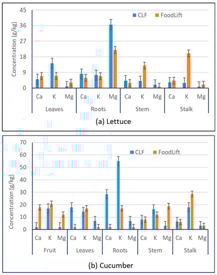 As far as potassium (Figure 3 and Table S2) is concerned, its concentrations in different structural parts of lettuce, cucumber, and tomato plants differ significantly between the plants grown using FoodLift and CLF (Figure 3). This is also reflected in the p-values as given in Table 4. Some differences, such as the ones between leaves, stems, and stalks in the case of lettuce, roots in the case of cucumber, and fruits, stems, and stalks in the case of tomatoes were found to be highly significant. However, again, there are no definite trends. Results do not indicate preference to any particular fertiliser in terms of uptake of cations by the plants. With respect to magnesium (Figure 3 and Table S2), there appears to be extremely significant differences in the Mg concentrations in the plants grown using Foodlift and CLF (Table 4).