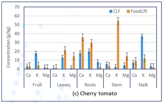 In addition to macronutrients (N and P), major cations, such as calcium (Ca), magnesium (Mg), and potassium (K) in the structural parts of harvested plants were analysed. Figure 3 and Table S2 show the average concentration of cations Ca, Mg, and K in harvested parts of plants, namely the fruit, roots, stem, stalk, and leaves of lettuce (Figure 3a), cucumber (Figure 3b), and cherry tomato (Figure 3c). In the case of lettuce, calcium concentrations in different parts of the plant grown using FoodLift appear to be significantly different to the calcium concentrations observed in the corresponding part of the plant grown using CLF (Figure 3a and Table 4). On the other hand, in the case of cucumber and cherry tomato, the calcium concentrations differ between the plants grown using FoodLift and CLF, only for certain structural parts of the plants (Table 4). However, there was no easily discernible trend in the calcium concentrations. The main differences were in roots. In addition to the roots, in the case of cucumber, there was a highly significant difference in calcium concentration in the leaves of the cucumber plants grown using FoodLift and CLF.