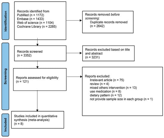 According to the search strategy, 5994 articles from the database were retrieved. The remaining records were 3352 after all duplicates were removed. Based on the titles and abstracts, 3231 studies were excluded, including animal experiments, non-RCTs, literature reviews, or studies that were not relevant to n-3 PUFAs. After screening the full text of the remaining 121 articles, 101 articles were excluded. The reasons were as follows: (i) irrelevant article (n = 75); (ii) review (n = 4); (iii) mixed others intervention (n = 13); (iv) use medication (n = 8); (v) dietary pattern (n = 12); (vi) did not provide sample size in each group (n = 1). Finally, eight trials with enough data were selected in this meta-analysis. The flow chart of selection is shown in Figure 1.