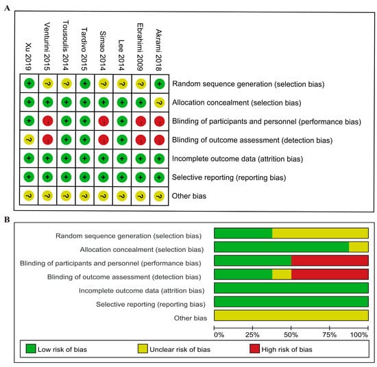 The assessment of bias risk of included studies: (A) Bias risk summary. Bias risk was classified as low (+), unclear (?), or high (−). (B) Bias risk graph. Reviewing authors’ judgments about the bias risk of each item, they were shown as percentages across all included studies.