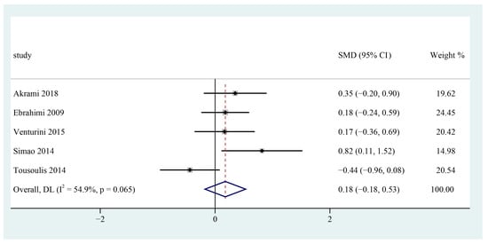 Five studies investigated the effects of supplementing n-3 PUFAs on serum LDL-c in patients with metabolic syndrome [,,,,]. Based on a meta-analysis of data from the included trials, it was indicated that supplementing n-3 PUFAs has no significant reduction in serum LDL-c level among patients with metabolic syndrome (SMD = 0.18; 95% CI: −0.18 ~ 0.53, I2 = 54.9%) (Figure 3).