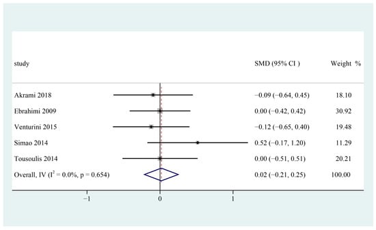 Five studies explored n-3 PUFA supplements’ effects on serum HDL-c in patients with metabolic syndrome [,,,,]. The pooled result revealed that supplementing n-3 PUFAs did not significantly increase serum high-density lipoprotein cholesterol levels among patients with metabolic syndrome (SMD = 0.02; 95% CI: −0.21 ~ 0.25, I2 = 0%) (Figure 4).