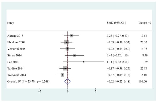Seven trials appraised the effects of n-3 PUFAs on serum TC in patients with metabolic syndrome [,,,,,,]. The pooled results indicated that n-3 PUFA consumption has no significant reduction in serum total cholesterol level in patients with metabolic syndrome (SMD = −0.02; 95% CI: −0.22~0.18, I2 = 23.7%) (Figure 5).