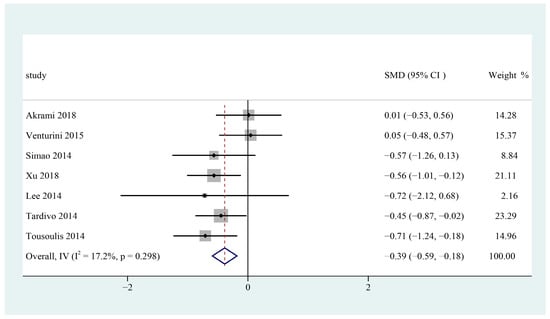 Seven trials were included to pool the data for the meta-analysis [,,,,,,]. The results showed that consuming n-3 PUFAs supplement may significantly decrease serum triglyceride levels in patients with metabolic syndrome (SMD = −0.39; 95% CI: −0.59 ~ −0.18, I2 = 17.2%) (Figure 6).