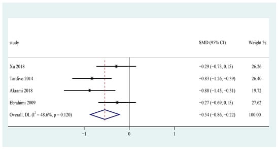 Four trials were included to pool the data for the meta-analysis [,,,]. The results showed that consuming n-3 PUFAs supplement may significantly decrease systolic blood pressure in patients with metabolic syndrome (SMD = −0.54; 95% CI: −0.86 ~ −0.22, I2 = 48.6%) (Figure 7).