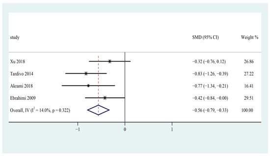 Four trials appraised the effects of n-3 PUFAs on diastolic blood pressure in patients with metabolic syndrome [,,,]. The pooled results revealed that n-3 PUFA consumption could significantly reduce diastolic blood pressure in patients with metabolic syndrome (SMD = −0.56; 95% CI: −0.79~ −0.33, I2 = 14.0%) (Figure 8).