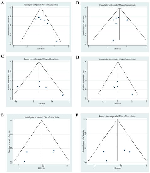 Funnel plots to evaluate publication bias and effect of omega-3 fatty acids supplementation for (A) TC, (B) TG, (C) LDL-c, (D) HDL-c, (E) SBP, and (F) DBP in patients with metabolic syndrome.